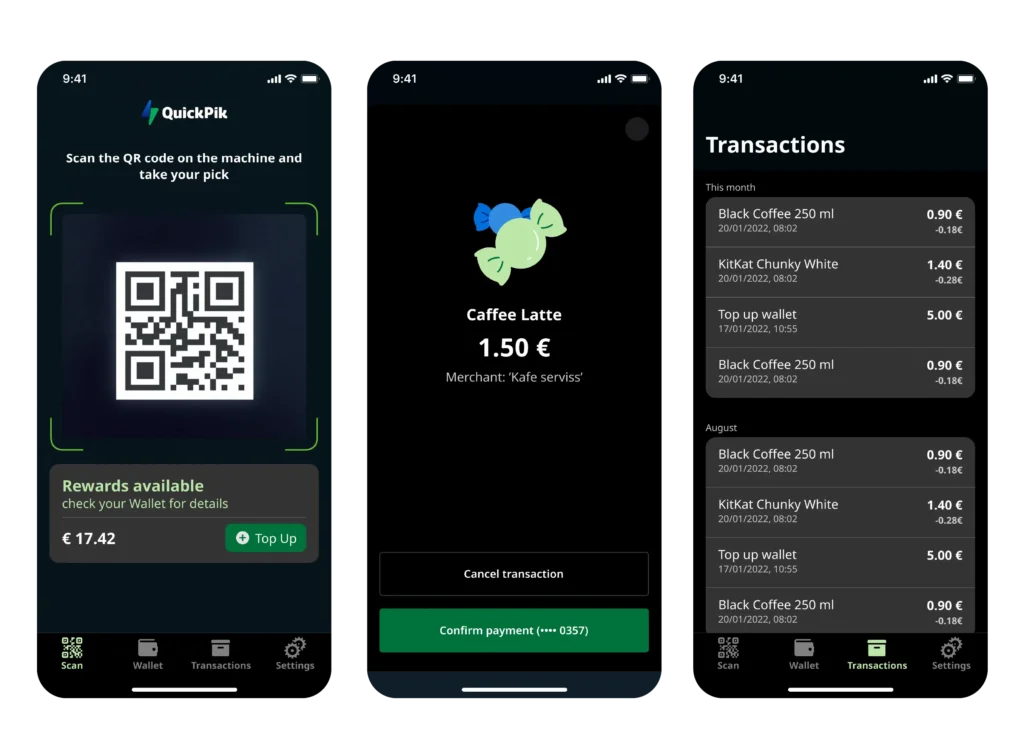 QuickPik also enables mobile payments through the same app. Users can link a bank card and pay directly from their phone across the operator’s vending and coffee machine fleet.
