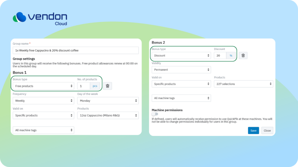 “Our goal with this release was practical control,” adds Emīls Miglinieks, Vendon IT Project Manager. “Two bonus types in one group sounds simple, but it lets operators shape benefits to each site without workarounds—and see the impact in Vendon Cloud the same day.”