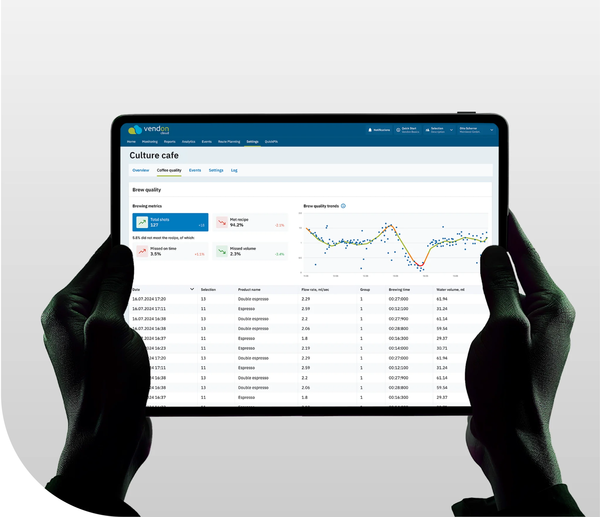 Vendon collects brewing data over time across all your locations. Use these insights to maintain consistency and support barista training with real performance data.
