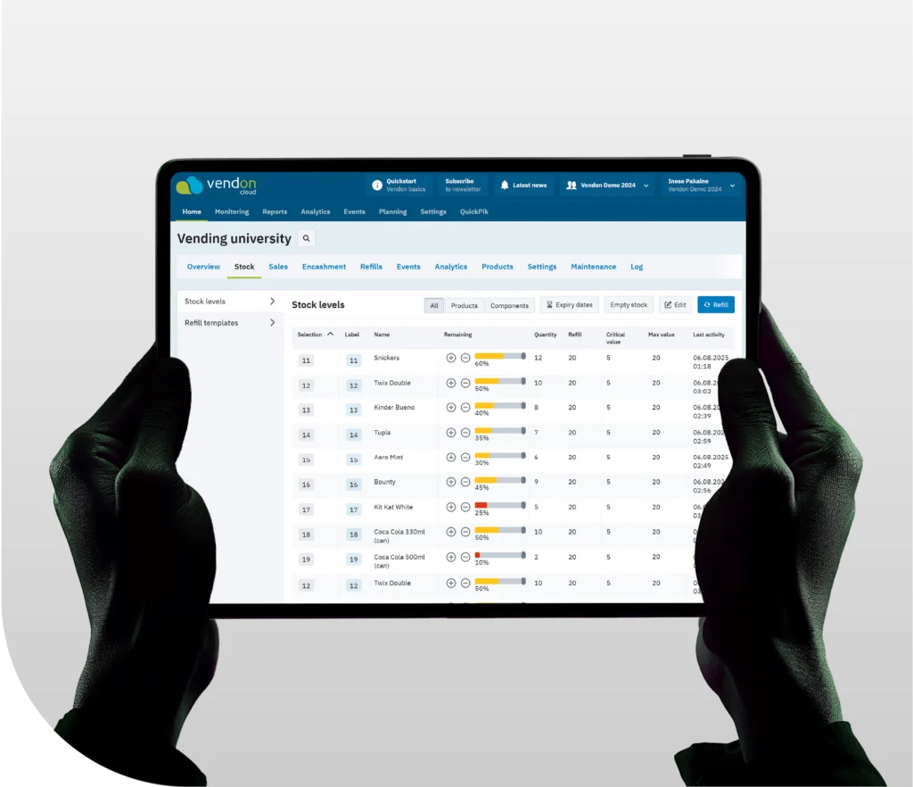 Check how much product or ingredient is left in every machine โ drinks, snacks, coffee beans, milk, and more.